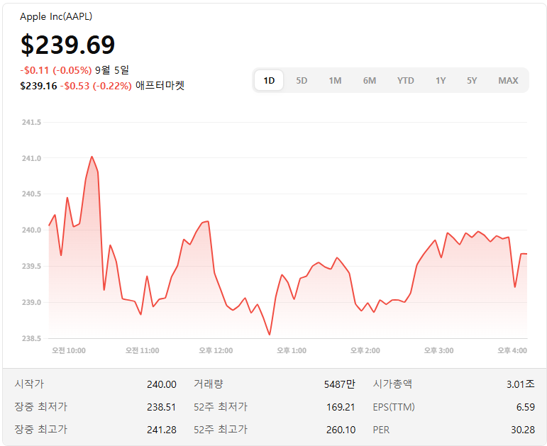Apple (AAPL): 현재 주가는 약 239.69 USD, PER 약 30.3배, EPS 6.59입니다.
